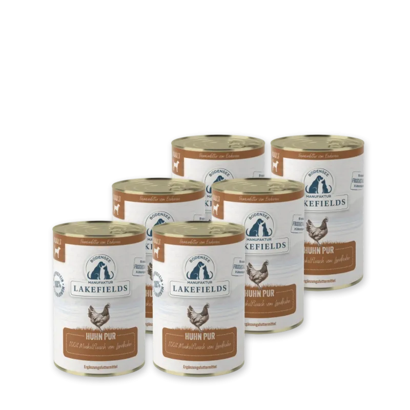 Das Lakefields Nassfutter Huhn PUR ist im praktischen 6 × 400 g Vorratspaket erhältlich. Diese Größe eignet sich hervorragend für die tägliche Fütterung von kleinen bis mittelgroßen Hunden oder als abwechslungsreiche Portion für größere Hunde. Mit dem 6er-Pack hast Du immer genügend Nassfutter Huhn PUR im Haus und kannst Deinen Vierbeiner zuverlässig mit hochwertigem Reinfleischfutter versorgen. Jede 400 g Dose lässt sich leicht öffnen und mit unseren Lakefields Dosendeckeln verschließen, sodass das Hundefutter nach dem Anbruch hygienisch gelagert und frisch bleibt.