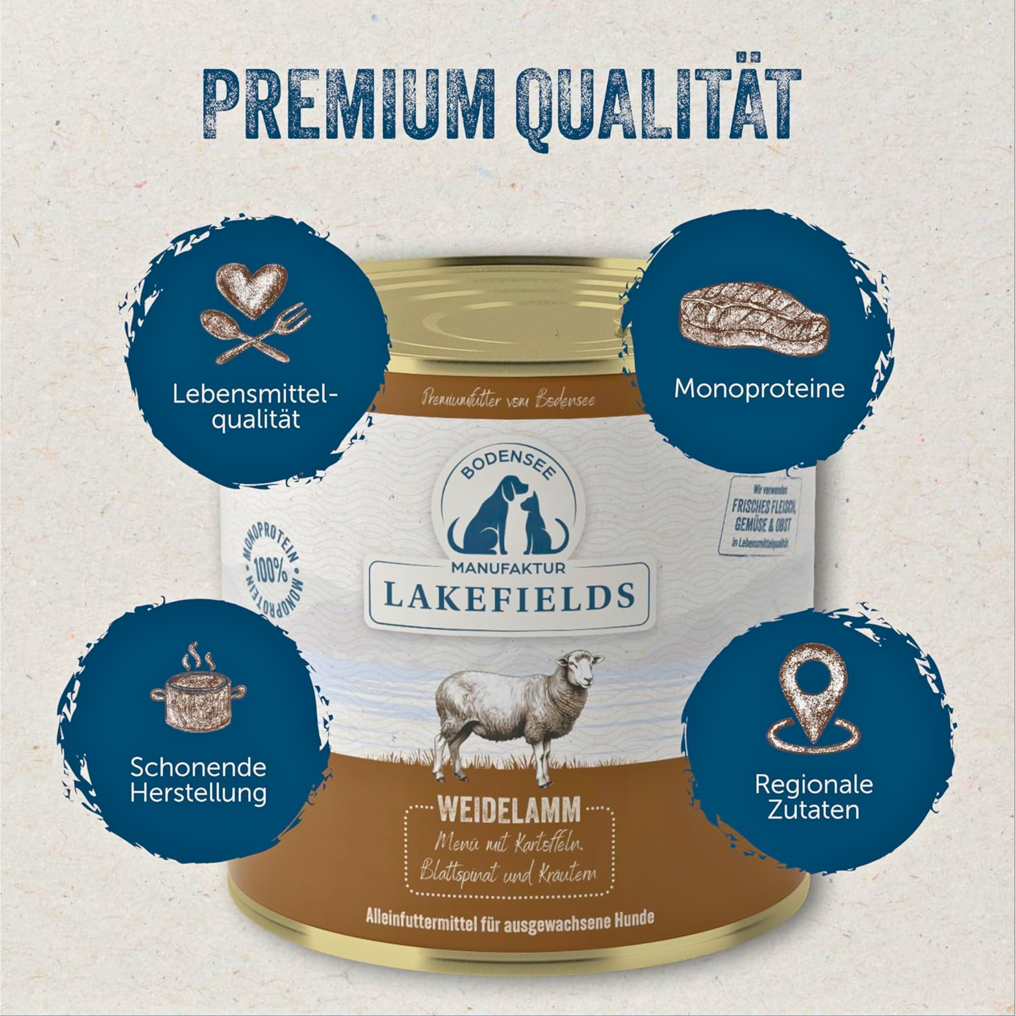 Das Lakefields Nassfutter-Menü Lamm ist ein hochwertiges, ausgewogenes Alleinfuttermittel für Hunde – hergestellt aus frischem Weidelammfleisch, regionalem Gemüse, Obst und aromatischen Kräutern aus der Bodenseeregion. Mit viel Liebe und Sorgfalt produziert, bietet dieses Hundefutter eine gesunde, artgerechte und besonders schmackhafte Mahlzeit für Deinen Vierbeiner.