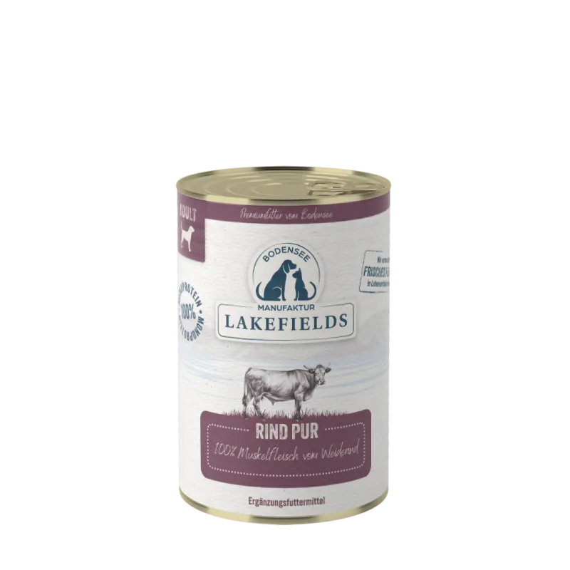 Das Lakefields Nassfutter Rind PUR ist auch im praktischen 6 × 400 g Vorratspaket erhältlich. Diese Größe eignet sich hervorragend für die tägliche Fütterung von kleinen bis mittelgroßen Hunden oder als abwechslungsreiche Portion für größere Hunde. Mit dem 6er-Pack hast Du immer genügend Nassfutter Rind PUR im Haus und kannst Deinen Vierbeiner zuverlässig mit hochwertigem Reinfleischfutter versorgen. Jede 400 g Dose lässt sich leicht öffnen und mit unseren Lakefields Dosendeckeln verschließen, sodass das Hundefutter nach dem Anbruch hygienisch gelagert und frisch bleibt.