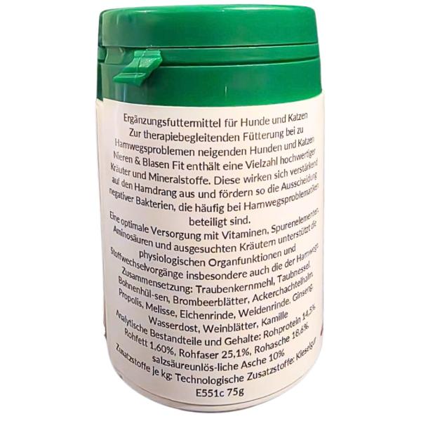 Zur therapiebegleitenden Fütterung bei zu Harnwegsproblemen neigenden Hunden und Katzen. Nieren & Blasen Fit enthält eine Vielzahl hochwertiger Kräuter und Mineralstoffe. Diese wirken sich verstärkend auf den Harndrang aus und fördern so die Ausscheidung negativer Bakterien, die häufig bei Harnwegsproblematiken beteiligt sind. Eine optimale Versorgung mit Vitaminen, Spurenelementen, Aminosäuren und ausgesuchten Kräutern unterstützt die physiologischen Organfunktionen und Stoffwechselvorgänge insbesondere auch der Harnwege.