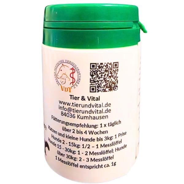 Fütterungsempfehlung: über 14 – 30 Tage 1mal täglich. Dosierung (1 Messlöffel entspricht ca. 1 Gramm):